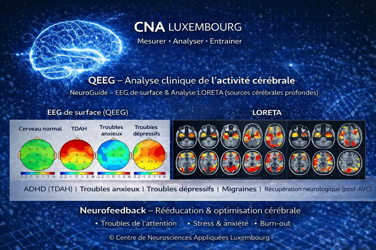 Le Centre de Neurosciences Appliquées – Bertrange propose exclusivement un neurofeedback dit “clinique”, basé sur l’analyse EEG/QEEG et des protocoles thérapeutiques individualisés.